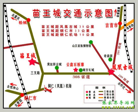 2、銅仁方向:自銅仁火車站往湖南方向經(jīng)過銅仁鳳凰飛機(jī)場附近(20公里處)、三岔路(23公里處)、蔬菜基地百合基地(26公里處)、中國苗王城牌樓(30公里處)、苗王茶園(30公里處)、苗王城生態(tài)農(nóng)業(yè)觀光點(diǎn)(桃林、金果林)、苗王城停車場售票處(33公里處)。