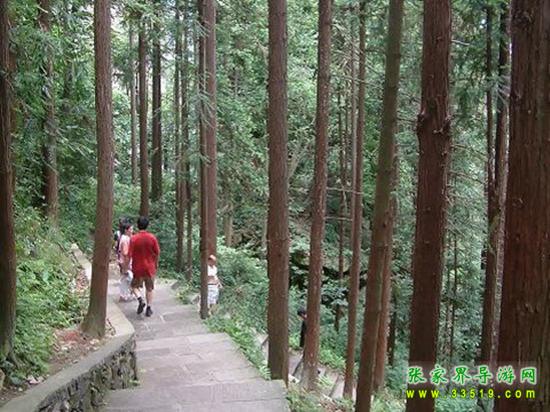 這一大片杉樹(shù)林是由張家界國(guó)營(yíng)林場(chǎng)(張家界國(guó)家森林公園的前身)工人們種植的。過(guò)去“大煉鋼鐵”運(yùn)動(dòng),差點(diǎn)把張家界的山頭全部變成了光頭。后來(lái),一些林場(chǎng)工人抱著“頭發(fā)白在張家界,牙齒掉在張家界,死了埋在張家界”的決心,“獻(xiàn)了青春獻(xiàn)終身,獻(xiàn)了終身獻(xiàn)子孫”,發(fā)誓要植樹(shù)造林,綠化張家界。幾十年過(guò)去了,許多人綠了青山白了頭,他們的心愿終于變成了眼前的現(xiàn)實(shí)。腳下這條彎彎曲曲而又平平整整的游道是20世紀(jì)80年代修建的。漫步其上,山風(fēng)陣陣、鳥(niǎo)雀聲聲、奇花朵朵,群峰在樹(shù)林中若隱若現(xiàn),很有“蟬鳴林逾靜,鳥(niǎo)鳴山更幽”的幽靜與“采菊東籬下,悠然見(jiàn)南山”的悠然。