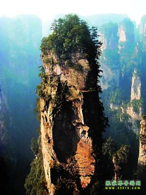 憑欄俯視,300余米高的峭壁猶如斧劈,草木叢生,幽洞玄奧,但聞水聲,不見溪谷。溪畔50米處一巨峰高達(dá)300余米,腰圍數(shù)十米,渾圓如柱,雄偉離奇。相傳共工與顓頊爭(zhēng)奪帝位失敗后怒觸不周山,折了天柱,飛來半截于此,故名乾坤柱。爾后許多神仙云游此地,留下不少古跡。此柱南有數(shù)條直達(dá)山頂?shù)木G色峽谷,似神仙往來的通道。右邊一峰柱,上不有如一只皮靴,稱神靴巖,相傳是曹國舅扔下的一只不合腳的靴子。觀景臺(tái)右側(cè)那株根部彎曲的古松名鐵拐松。