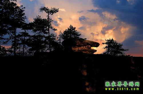 從黃石寨頂西邊下山時(shí),后卡門(mén)邊一頂部呈平展臺(tái)面的石峰上,一只長(zhǎng)約5米的石龜頭部向前,作爬行狀。晴天,龜巖呈金黃色,故稱金龜。氣候的變化又可使其呈現(xiàn)各種不同顏色和形狀,故它又有“霧海金龜”、“金龜探海”、“落日金龜”等幾個(gè)別名。