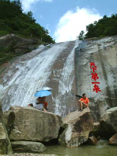 水簾洞瀑布源頭,在紫蓋峰的泉水。三支泉水匯集一起,流入水簾洞上方谷地。谷地闊三丈,原是梁朝的九位真人白日飛升的棲息之地,后建造九仙觀。九仙觀附近有太陽(yáng)泉、洗心泉、洞真源、仙人池等。相傳泉水深不可測(cè)。泉水從石壁上飛流直瀉,發(fā)出雷鳴般的聲音,聲傳十里。明朝張居正游此地后說(shuō):“瀑泉灑落,水簾數(shù)疊,掛于云際,垂如貫珠,霏如削玉”。確實(shí),它從絕壁上噴瀉下來(lái),寬達(dá)三太,高五十余米,瀉珠濺玉,仿佛一幅巨大的白布簾,在石壁當(dāng)中被亂石嶙巖擋住,然后再?gòu)氖p里屈曲折射,跳躍出來(lái),滿(mǎn)谷水花四濺,閃爍著晶瑩奪目的光彩。水簾絕壁下的碧潭,天上的云彩和兩邊的蒼翠的山巒,構(gòu)成一幅美麗的山水畫(huà)。明朝張居正作《水簾洞》一贊道:“誤疑瀛海翻瓊浪,莫擬銀河倒碧流;自是湘妃深隱處,水晶簾掛五去頭”。這首詩(shī)可說(shuō)是寫(xiě)出了水簾洞的光、聲、影三絕的奇景了。