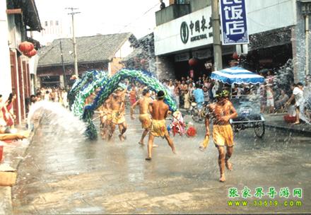 張家界潑水龍又叫“澆水龍”,于唐朝時(shí)期由移居本地的白族興起演變而成,在永定區(qū)的尹家溪鎮(zhèn)西尹村、莫家崗村十分盛行,是當(dāng)?shù)?a class="insidelink" href="http://m.856641.com/fengqing/" title="土家族">土家族,白族、苗族在天熱干旱時(shí)節(jié)求雨祈福的一種形式。一旦出現(xiàn)旱災(zāi),當(dāng)?shù)仡^面人物就會(huì)出來組織潑水龍,演出極其隆重。