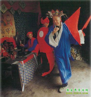 儺戲在湘西土家族地區(qū)也稱儺堂戲、儺神戲,它與土家族原始巫教、巫術的關系極為密切。土家族先民信奉的神有儺神、八部大神、土地神等,作為一種宗教活動,這種原始信仰與社會生產(chǎn)活動、文娛活動及民族習俗是融為一體的,因此儺戲最先的“沖儺還原”帶有明顯迷信色彩,土家族群眾中有“一儺沖百鬼,一愿了千神”的說法,湘西土家族人干脆叫它為“神戲”。湘西土家族儺戲的發(fā)展過程大體是儺、儺舞、儺儀然后才產(chǎn)生儺戲。儺舞源于久遠的蒙昧時期,土家先民們在同大自然作斗爭、同毒蟲猛獸作斗爭,便產(chǎn)生了化裝護面、在鼓樂聲中奔騰呼號、沖殺跳躍的原始儺舞,其所模擬的鳥雀舞、猿猴舞、熊舞等頗為壯觀。儺舞與儺這種驅鬼消災的祭祀儀式結合后,增加了祈求人獸平安、五谷豐登、緬懷祖先、勸人去惡從善、以及傳播生產(chǎn)知識等內容,這就逐漸形成了兼?zhèn)潢U弘教義及娛樂性質的祭祀風俗歌舞。[2]土家族儺戲就是在此基礎上發(fā)展起來的。部分土家族學者認為土家族儺戲的遠源可以追溯到戰(zhàn)國時代的《九歌》,《九歌》是土家族儺戲的雛形,他們的依據(jù)是當時楚國的沅湘流域,人們“信巫鬼、重淫祀”(《漢書·地理志》),從而使得“陰陽人鬼之間,又或不能無褻慢淫荒之雜”(宋代朱熹《楚辭集注》)。屈原正是加工整理了這一類“鄙陋”之詞,才創(chuàng)作出《九歌》、《天問》等名篇。也有部分學者不贊同這種論點,他們認為土家族儺在宋代還停留在儺祭和儺舞階段,最遲到明代,土家族儺才發(fā)展成為儺戲[3]。嘉靖《常德府志》記載:“歲除,歲將盡數(shù)日,鄉(xiāng)村多用巫師,朱裳鬼面,鑼鼓喧舞竟夜,名曰還儺。”文中未點明“儺戲”二字,但卻使用了“還儺”一詞,這與今天民間對儺戲的稱呼相似。又據(jù)清乾隆《永順縣志》載:“永俗酬神,必延辰郡巫師唱演儺戲,……至晚,演儺戲。敲鑼擊鼓,人各紙面一,有女裝者,曰孟姜女;男扮者,曰范七郎。”在土家族儺戲中,孟姜女傳說故事占著非常重要的地位。在湘西土家族地區(qū),儺戲一般有二十四正戲,即二十四戲神。每次儺儀結束時,巫師要用香火在黃裱紙上燒二十四個洞,以表示奠祭二十四戲神。民間有諺語:“儺神菩薩不識字,只要二十四個圈圈滿。”在二十四儺神中,被稱為勾愿神的姜女、范郎是還儺愿時非常重要的兩位神靈。在儺戲中,《孟姜女》是整場的高潮,平時,儺戲唱完后,由沒下裝的孟姜女、范郎去向主人家及觀眾“拜臺”,以示“了愿”。清代中期以后,儺戲吸取了花燈、陽戲、高腔等其他地方戲劇劇種的唱腔和劇目,逐漸變得日益成熟。我們仔細查看了全國371個劇種,發(fā)現(xiàn)儺戲、花燈戲有著相同的班社,也就是說一個演出班社可以演出儺戲、花燈戲兩個劇種。這段時期,儺戲已作為獨立戲劇劇種參加演出。由于儺戲是由巫儺法事演變而成的戲劇形式,經(jīng)歷著巫儺法事(驅鬼祭祀)、儺壇上戲和儺堂正戲的發(fā)展過程。