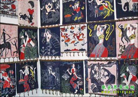 織錦。又名“西蘭卡普”、“土花鋪蓋”,為土家族傳統(tǒng)工藝品之一,是森林公園工藝品廠的主要產品??楀\是在特制的本質織機上以錦紗為經、五彩絲線為緯、手工提花織成。以其質地厚實、堅韌,色彩鮮艷,格調古樸,流暢生動著稱。圖案有花草、鳥獸、生產、生活、幾何、字樣等種類。為舊時土家姑娘必備嫁妝之一。據考證,早在漢代,土家織錦就作為方物貢入漢室宮廷。20世紀后,土家織錦曾漂洋過海至日、美、英等國展出,并作為禮品,被國家領導人贈送給外國元首及政府官員,如今織錦以壁掛、枕巾、沙發(fā)墊、桌圍、提袋、服飾等多種式樣遠銷世界各地。