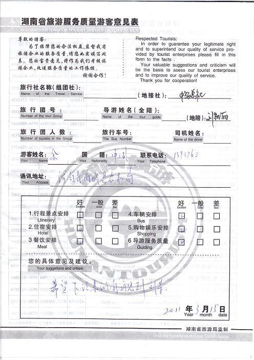2011年3月15日余先生旅游服務(wù)質(zhì)量反饋:希望下次來還能再見到劉導(dǎo)