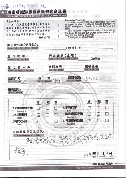 2011年4月22日劉小姐一行2人旅游質(zhì)量反饋:導(dǎo)游態(tài)度很好,希望下次來(lái)還要他接待