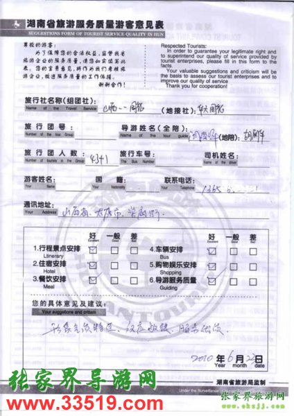 2010年6月23日山西國旅一行43位旅游質(zhì)量反饋