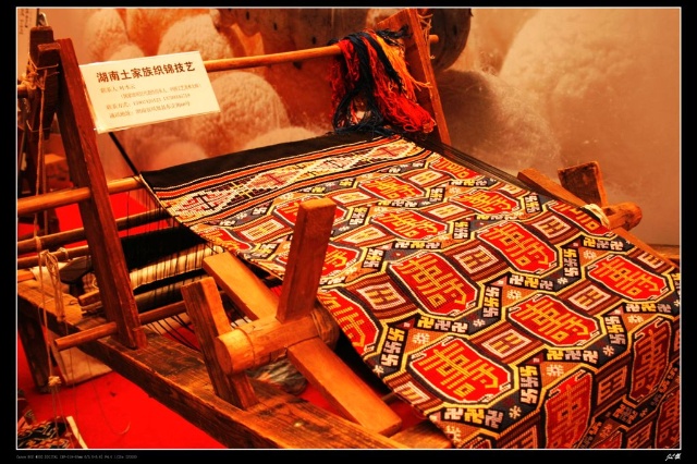 土家織錦的歷史悠久。早在漢代,它就初露頭角?!逗鬂h書.西南蠻夷傳》記載,“武陵蠻織績(jī)木皮,染以草,衣裳斑斕……”清同治年間編修的《永定縣志》也說:“土錦績(jī)五顏經(jīng)線為之,文彩斑斕可愛,使用以為被,或作衣裙,或作巾,故又稱‘筒巾’。”